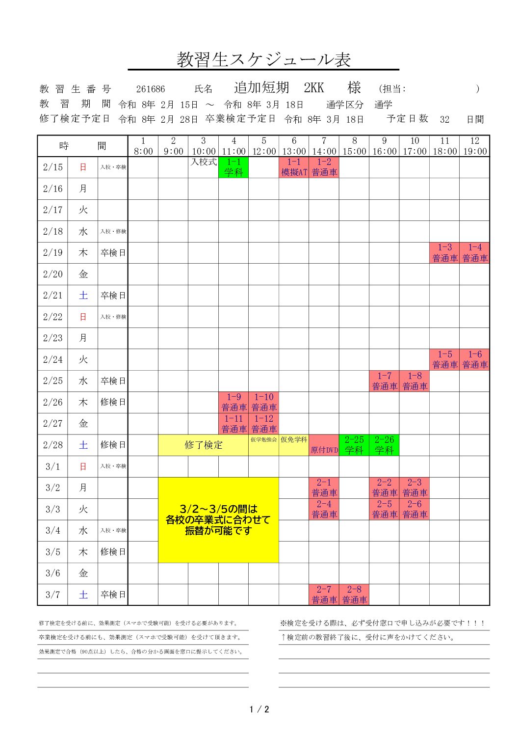 | 選択 | 入校日 | 修了検定日 | 卒業予定日 | 予約残数 | 予定表 |
