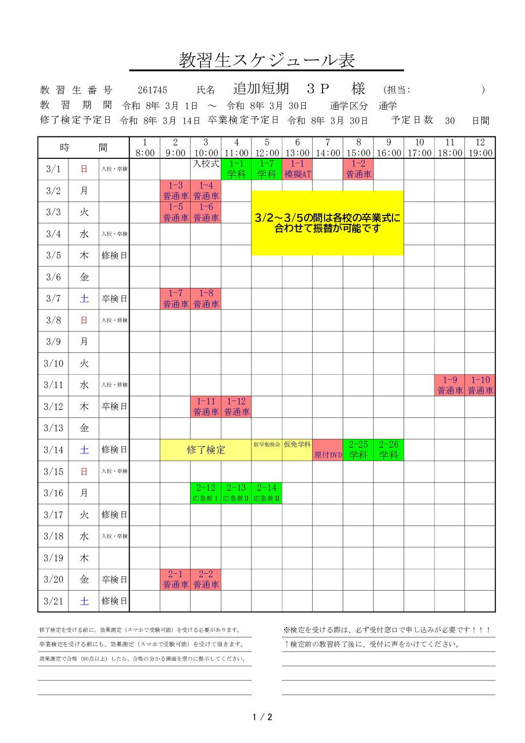 | 3/2~3/5の間は各校の卒業式に合わせて振替できます! ※スケジュールは一例です |